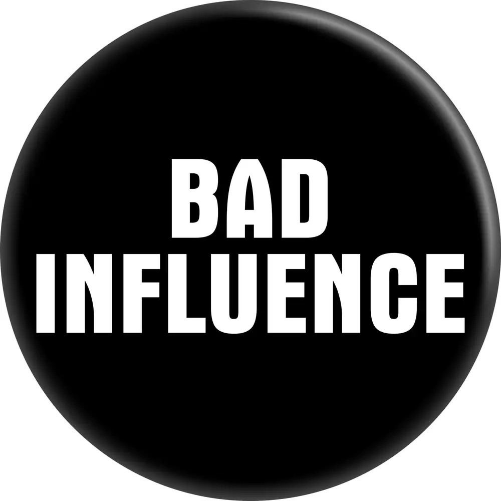 Bad Influence This 1.5 inch pin-back button features bold white text on a black background that reads Bad Influence. Perfect for anyone who is proud to be the reason your friends have great stories - or terrible decisions. Wear it as a warning label, a badge of honor, or just to keep things interesting. Great for parties, pranksters, and the friend everyone secretly blames. Proudly Made in USA