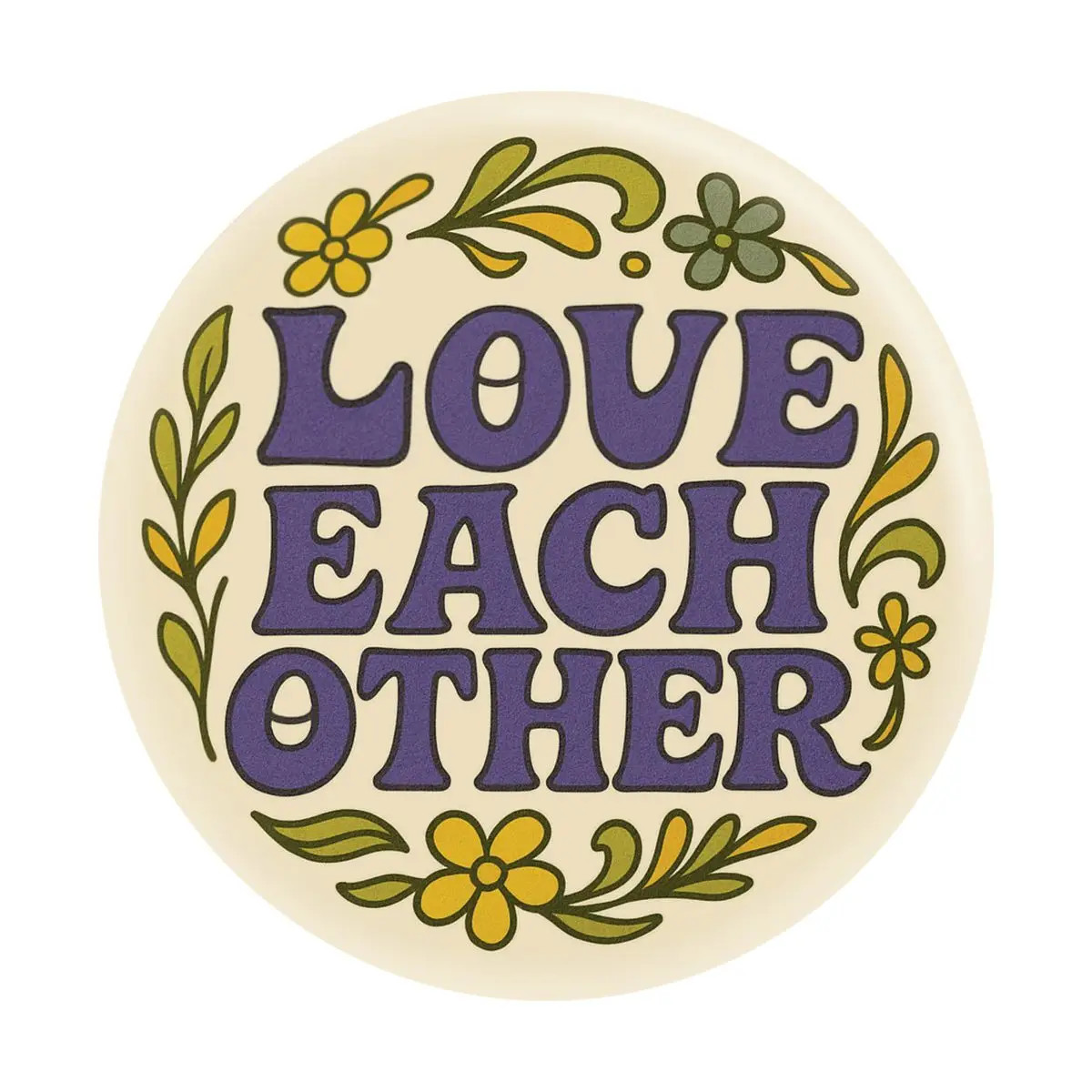 Spread positivity everywhere you go with this 1.5 inch round button featuring the uplifting phrase "Love Each Other" in bold purple letters surrounded by retro floral accents. With its groovy vintage style, this button is a perfect accessory for jackets, backpacks, hats, or pin collections.